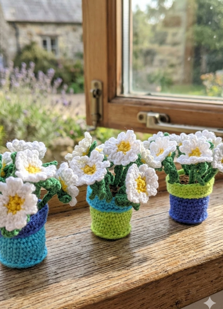 Haak je eigen bloemen gnome, in groot of klein formaat.