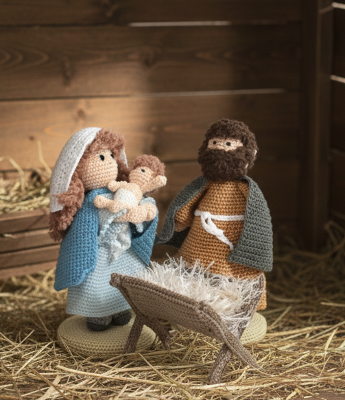 Dit ontwerp is een onderdeel uit een grote kerstgroep. Dit ontwerp omvat alleen Maria, Jozef en de Kribbe met Kindje Jezus. Kijk voor de overige ontwerpen op Etsy en haak de complete kerstgroep!